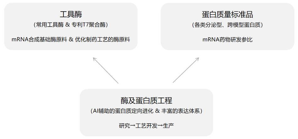 依诺生物构建了酶与蛋白质的制备与合成能力,实现了T7 RNA聚合酶、DNase I、BspQ I、RNase Inhibitor、无机焦磷酸酶等mRNA生产所需要的全部工具酶以及各类蛋白质标准品的制备和生产,满足客户mRNA药物开发最基本的关键酶原料和研究及质量分析参比样品需求。在此基础上,依诺生物建立了机器学习和传统酶定向进化相结合的酶设计平台,满足客户各类个性化的酶设计和定制生产需求,同时通过定向进化开发了一系列性能优异的新型自主知识产权工具酶以帮助客户进一步从源头优化制药工艺。